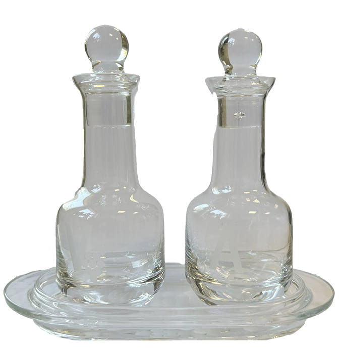 Ampułki z mosiężną tacką. Pojemność 200 ml., wymiary tacki 23x14 cm.