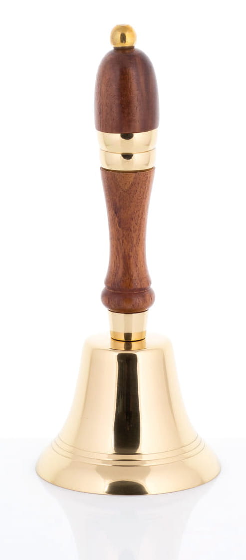 Dzwonek procesyjny, metalowy z drewnianą rączką w kolorze jasnym.
