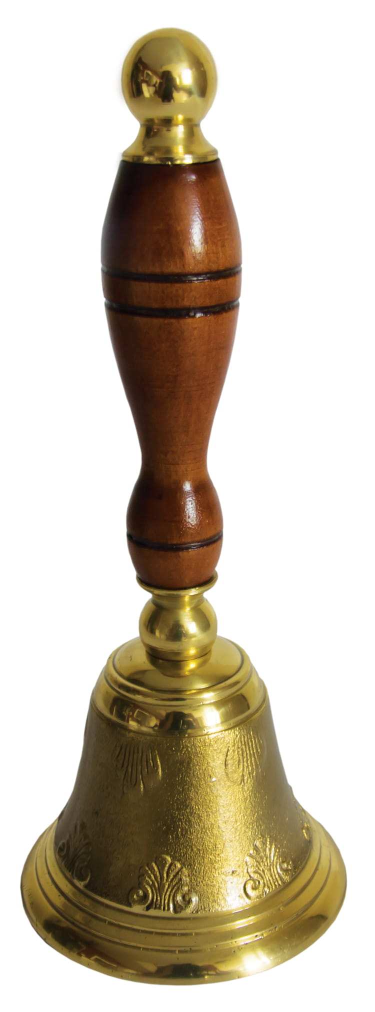 Dzwonek procesyjny, metalowy z drewnianą rączką w kolorze jasnym.