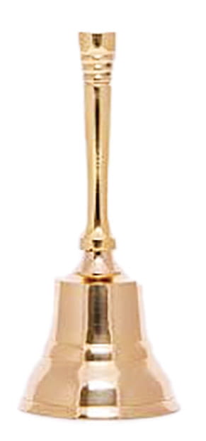 Dzwonek procesyjny, metalowy z drewnianą rączką w kolorze jasnym.