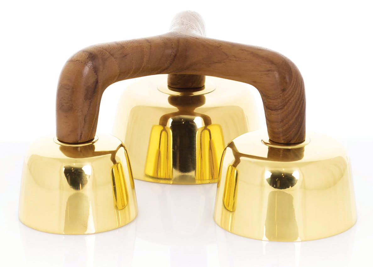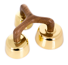 Dzwonek potrójny, mosiężny z drewniana rączką.