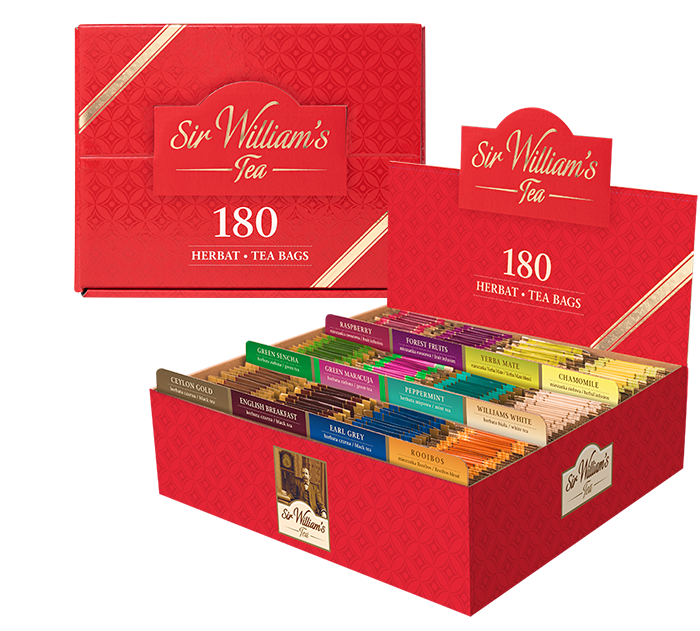 12 rodzajów herbat Sir William's po 15 saszetek: Ceylon Gold, English Breakfast, Earl Grey, Rooibos, Green Sencha, Green Maracuja, Peppermint, Williams White, Raspberry, Forest Fruits, Yerba Mate, Chamomile
