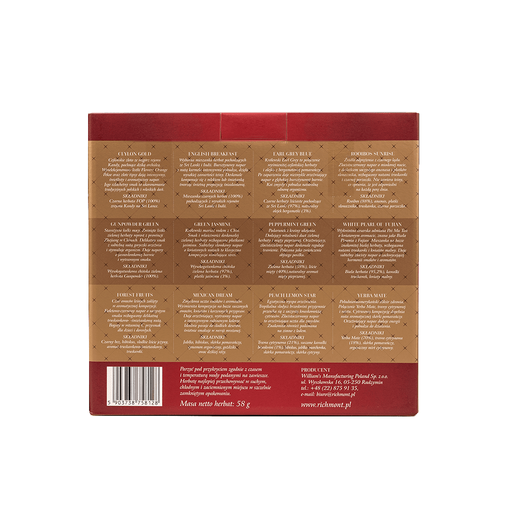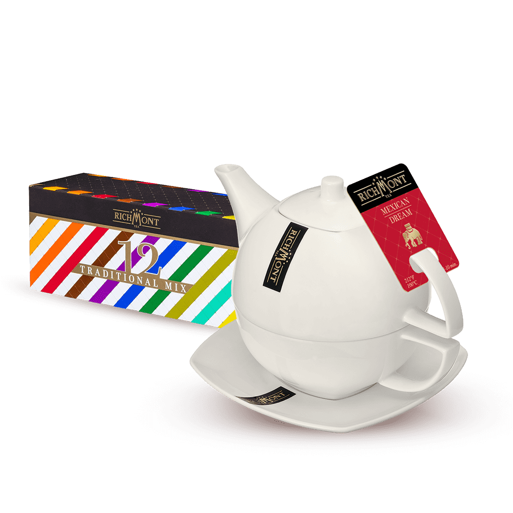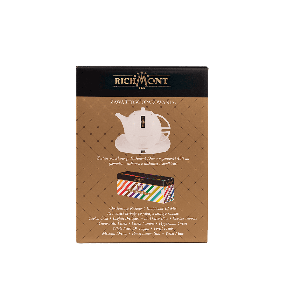 Zawarość opakowania: zestaw porcelanowy Richmont Duo o pojemności 450 ml (komplet – dzbanek z filiżanką i spodkiem), opakowanie Richmont Traditional 12 Mix – 12 saszetek herbaty po jednej z każdego smaku: